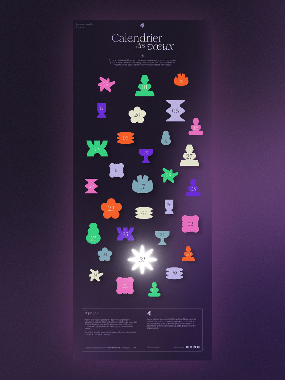 L’agence a conçu ce calendrier des vœux digital pour valoriser les savoir-faire et les talents cachés de toute son équipe. Chaque jour révèlera une surprise différente, concoctée par nos collaborateurs, jusqu’à la nouvelle année. Un grand merci à toute l’équipe pour la participation, chaque jour, d’une nouvelle surprise !